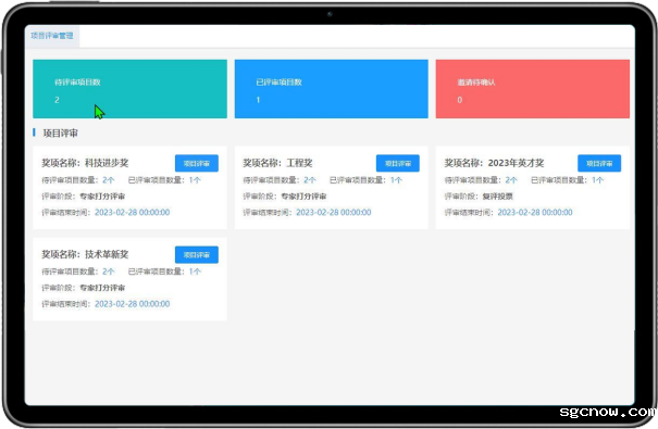 支持针对列表中显示项及搜索项的展示,针对显示字段可自定义排序,支持事件结果字段展示(如专家分配情况);支持对审批流程中的待审以及已审数据进行状态跟进,对分配的专家(评审员)可以进行更换,对未及时评审的专家(评审员)拥有催办功能,催办可分为短信催办、邮件催办和企业微信消息催办三种形式。针对各步骤中的过程数据进行不同维度的视图展示,如专家投票过程中产出的数据分别以待办评审视图、专家视图、项目视图和结果视图进行展示。