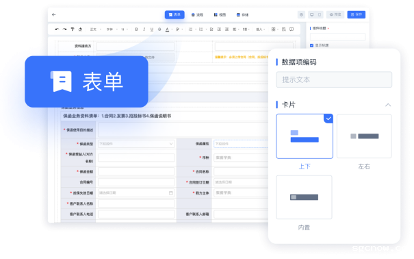 表单引擎提供多种设计控件,包括布局控件、字段控件和常用控件等,强大的公式支撑复杂业务的验证,能够做到“零代码”。可以满足不同报评业务场景表单的构建需求,提供文本、数字、多行文本、下拉列表、日期、时间、树状结构、编码等数十余种控件,轻松实现各种业务逻辑。