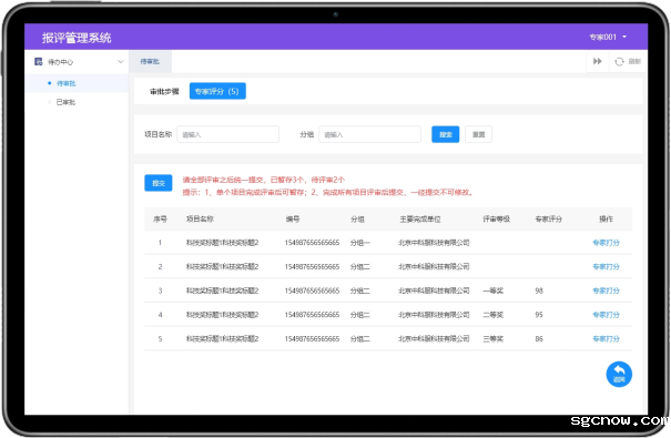 专家通过登录系统平台可以在线对需要评审的项目进行打分或是投票。支持通过电脑端或是移动手机端进行评审。针对专家评分可以进行排序:已打分项目排序靠后,已开始未完成打分的项目(没打完分先保存)排序靠前,没有已开始打分项目就把未打分项目靠前。同时专家打分针对申报资料和打分表支持双开显示,左侧看材料,右侧评分。