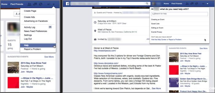 Facebook.com:帮助窗口的指示指导用户去使用网页右上角的一个元素,它在这个层叠窗口里。用户必须关掉窗口才能找到下面的按钮,如果用户还需要帮助,他们需要重新打开帮助窗口。