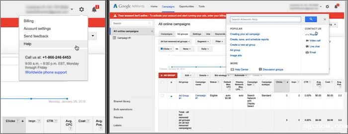 Google AdWords:从设置菜单里选择帮助按钮后(左),帮助窗口才出现(右)。