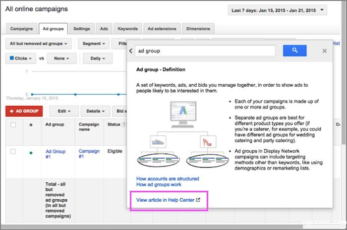 Google AdWords:在Campaigns页面选择Ad groups标签后,自适应帮助菜单提示了与campaigns 和ad groups相关的主题。