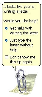 微软的回形针动画助手,是广为人知的智能帮助系统之一。如果系统检测到用户输入“Dear Jakob,”助手会在角落里出现,提供创作和书信的帮助。