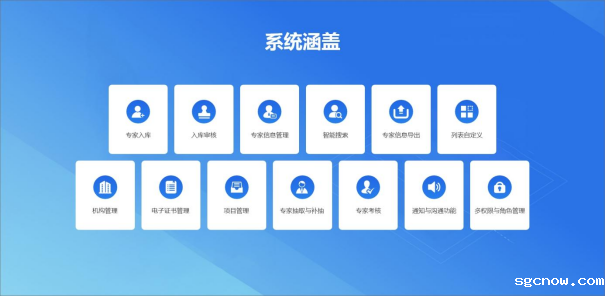 系统从“专家管理+项目管理+评审抽取管理+专家综合评价+通知功能+专家费管理”六个方面进行整体规划,功能点包括:专家申请、专家推荐、专家管理(如专家审核、到期通知、专家档案管理、专家到期提醒)、抽取项目管理、项目抽取管理、数据统计分析、通知功能、专家服务、专家证书、专家费管理。